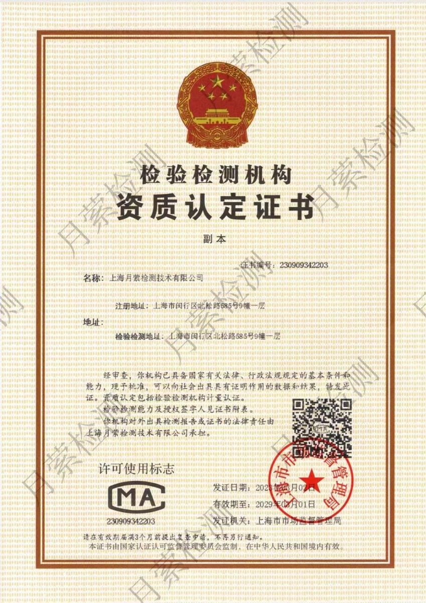 上海月縈檢測技術有限公司是擁有上海市市管局頒發的CMA資質第三方檢測單位,公司秉持“誠信為本、質量為先、嚴謹公正、服務至上”的質量方針,力爭成為全國一流的環境可靠性檢測實驗室。